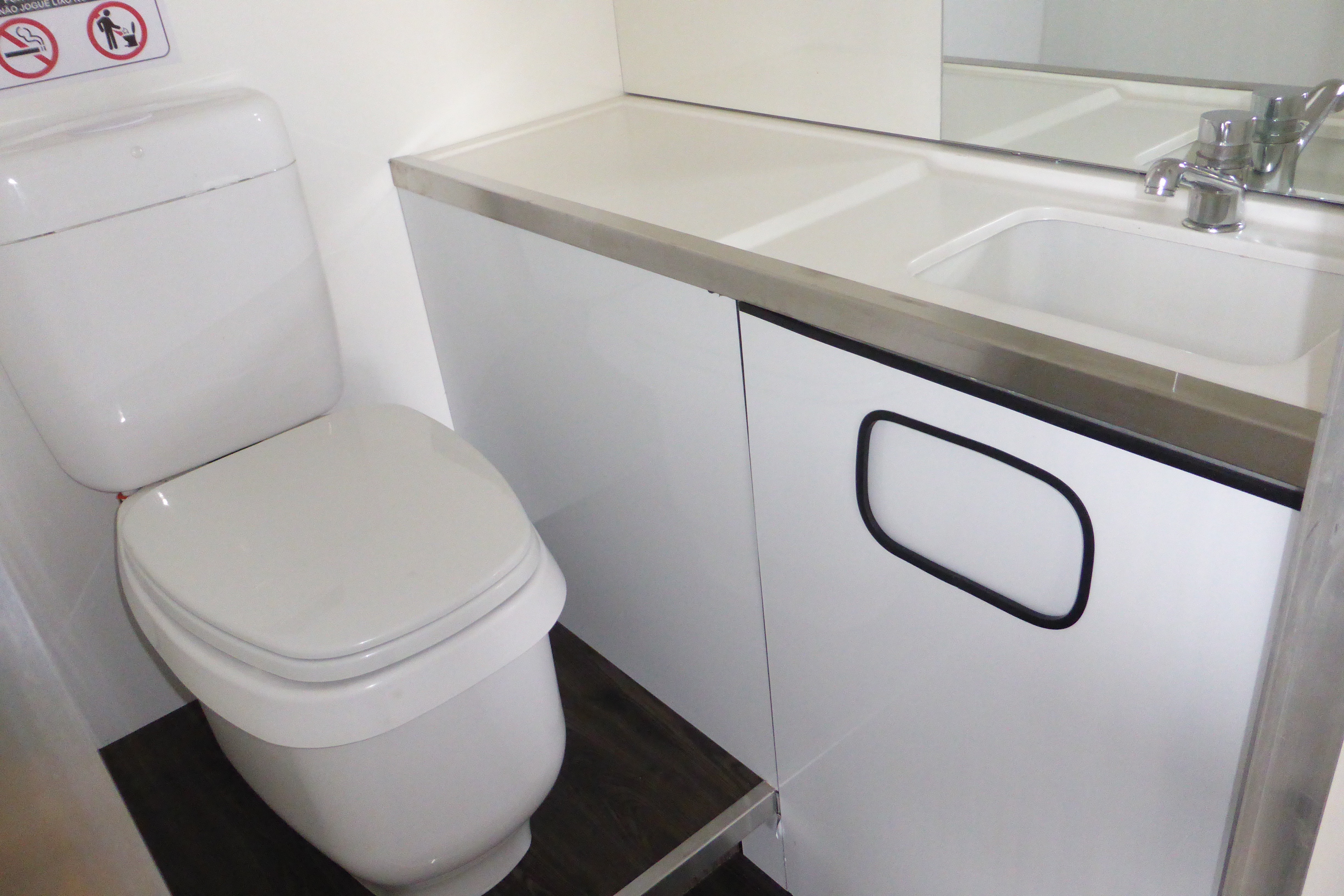 Equipados com: Pia, Bancada, Espelho “full-size”, Vaso Sanitário com descarga (selado e sem cheiro), Agua pressurizada, Iluminação Led, Teto Solar, Ventilação e Iluminação Natural, Paredes Térmicas, Lixeiras Embutidas, Tanques internos de agua e detrito.