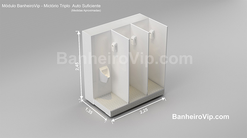 Ideal para aumentar a fluidez e capacidade de atendimento das instalações masculinas cada Módulo Mictório Triplo pode atender até 800 usos sem necessitar drenagem. Sua ligação a rede de esgoto local é extremamente simples e quando conectado pode funcionar continuamente sem limite de usos.