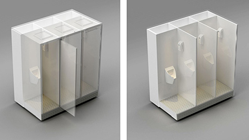 Módulo Mictório Triplo oferece 3 cabines individuais com mictórios independentes, totalmente privativos. Otimizando o uso do espaço, Módulos Mictórios consomem o mesmo espaço de um Módulo Duplo, oferecendo 1 porta a mais.